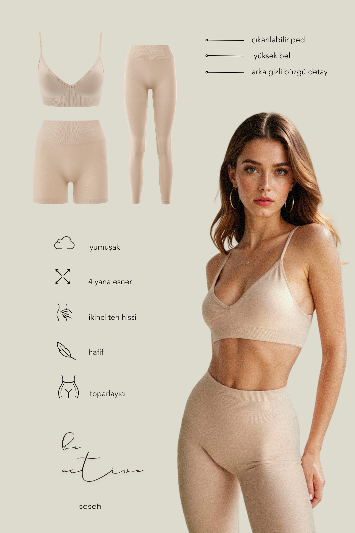Eleve Seamless Scrunch Leggings are a design that combines elegance and performance, designed with 93% polyamide and 7% elastane content. The improved polyamide fabric increases flexibility and durability, while providing superior comfort for sports and daily use.